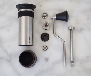 Precision hand grinder with conical burr set.