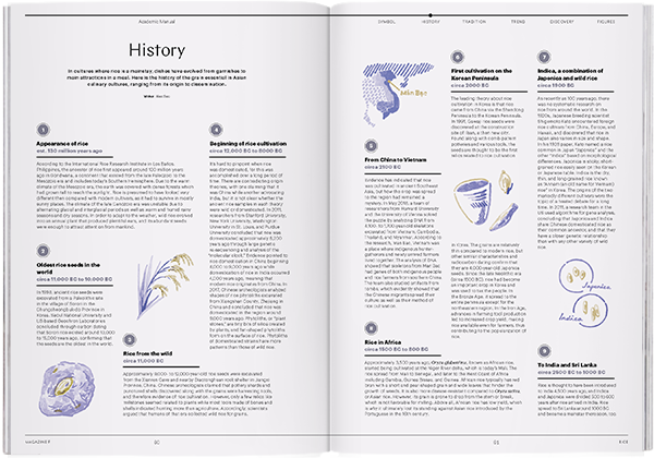Rice, a key ingredient in Asian food culture, has been directly linked to survival itself as a daily staple food. Along with corn and wheat, it is considered one of the world’s top food crops, and acts as an essential source of carbohydrates, a vital nutrient for the human body. More than half of the world’s population has relied on rice as a main food supply. In addition, rice farming, the basis for rice production, has helped to form societies with community-centered consciousness in Asian countries like Korea and Japan, and also symbolizes the value of protecting tradition. Foods like pilaf, risotto, sushi, and rice cakes have derived from various cultivars and recipes. Recent patterns of reduced consumption have been overcome with development in agricultural technology and advanced strategies, and rice is being illuminated once again as an alternate food ingredient.