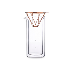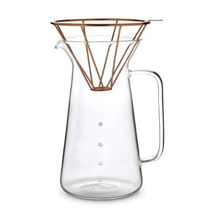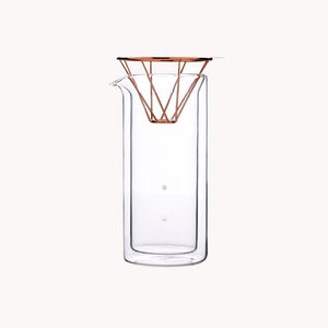 The minimalist copper wire dripper is the most remarkable feature of this design. Suitable for the common V60 filter paper, the structure holds the filter paper nicely and also presents an aesthetic copper tone when dripping. The design of 600ml Coffee Carafe provides a sense of lightness and safety at the same time. The triangular shape of the carafe neck can hold the dripper stably and the graphics of four simple circles on the carafe indicate the portion of the coffee quantities, which makes it clean and easy to be recognized.