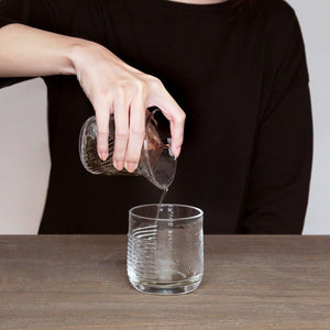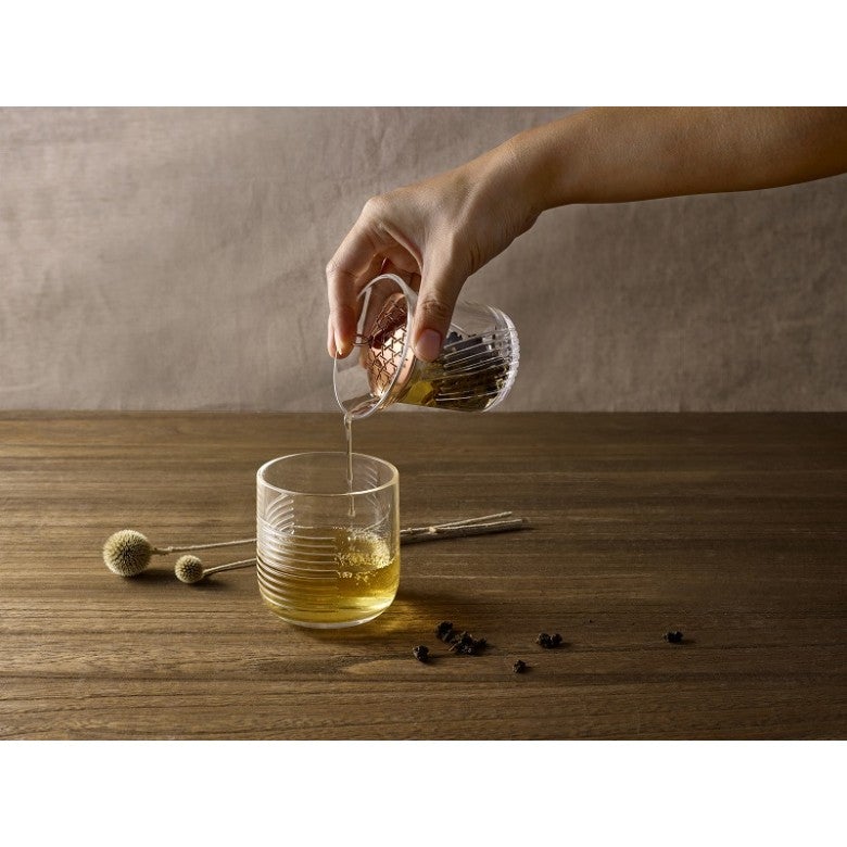 Designers re-interpret this traditional tea-making method with a modern design perspective and material of glass. When making tea with WEAVER small teapot set, firstly add tea leaves and small-quantity boiled water into the teapot, wait for seconds and use the copper infuser to pour the tea into the glass cup. Repeat the movement for another 4-5 times until the teacup is 80% full. The slow and elegant movement gives tea leaves more time and space to be extracted to its best flavor, which creates more gentle and balanced tea flavors. The geometric pattern on the surface of the glass shows the techniques of glass craftsmanship. It also shows a splendid golden color of good tea when you’re using it.