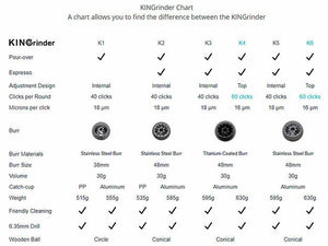 KINGrinder is a heavy duty and durable manual coffee grinder that guarantees precision and functionality. KINGrinder K1 was made for pour overs. Features 38mm stainless-steel burrs and 40 click adjustments with an 18μm for each click.