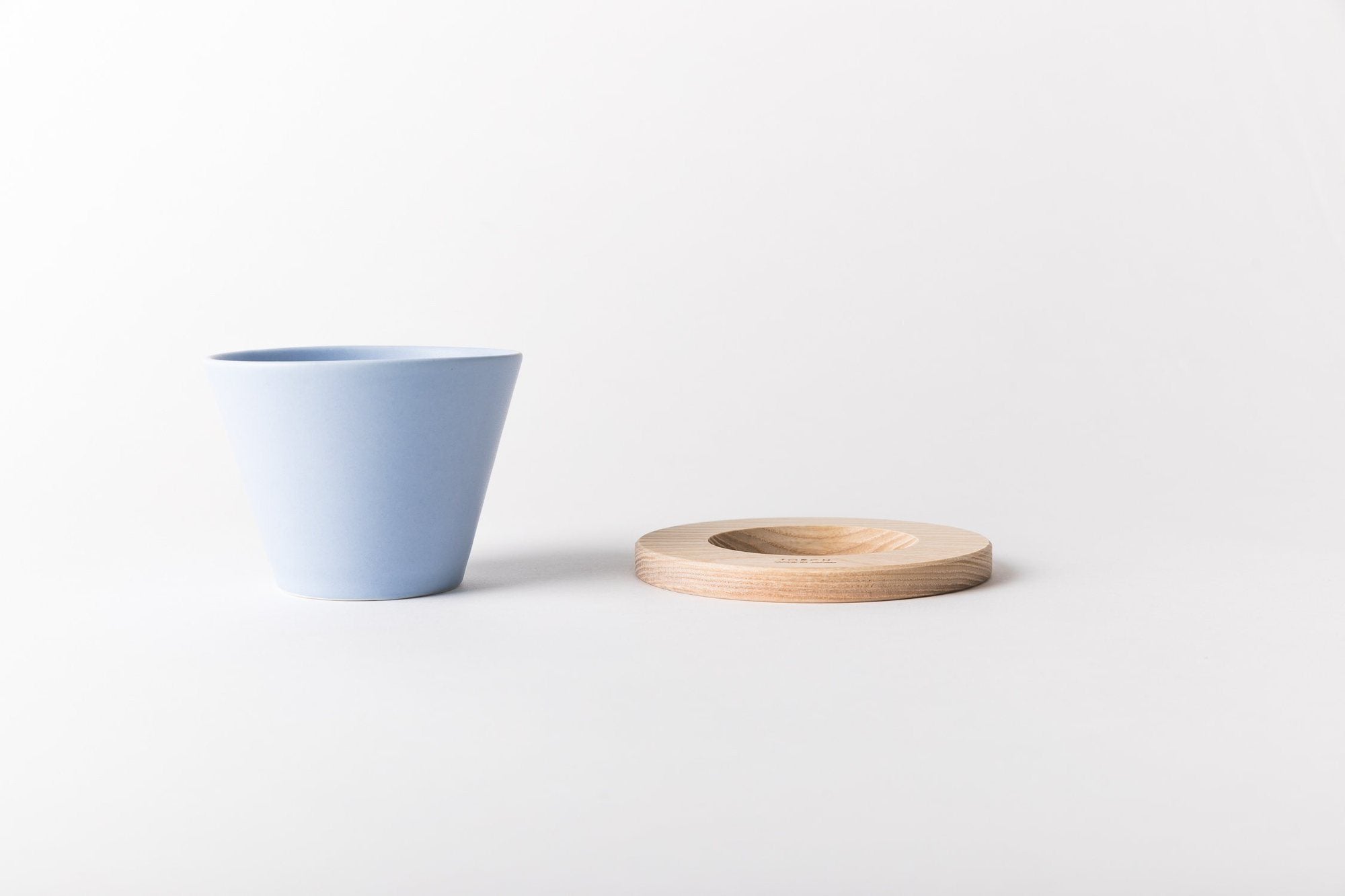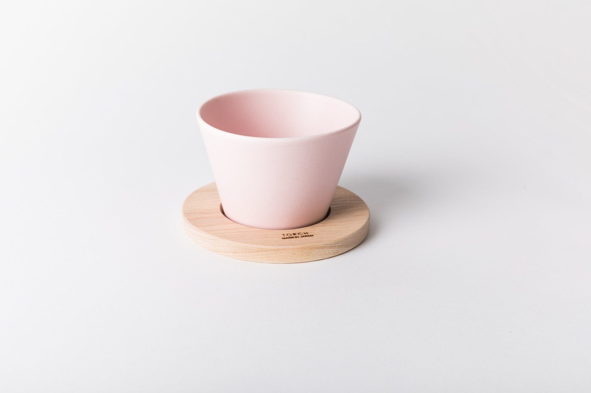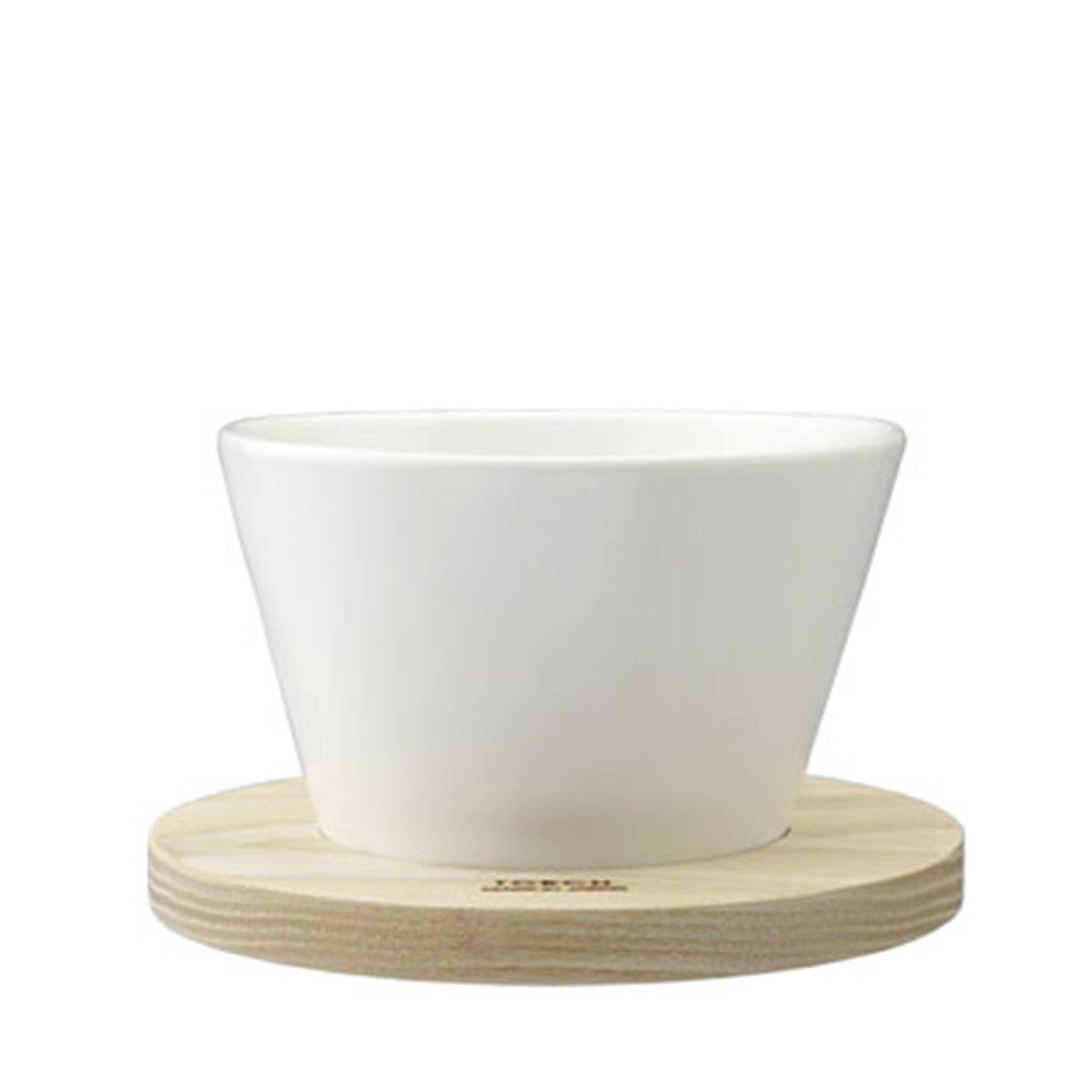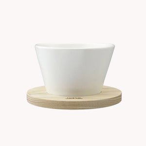 Each Torch dripper set features an exquisite white Japanese Mino Yaki style porcelain dripper with an untreated, white ash base. Over time the attractive wooden base gains additional character from the natural patterns and staining of regular use.